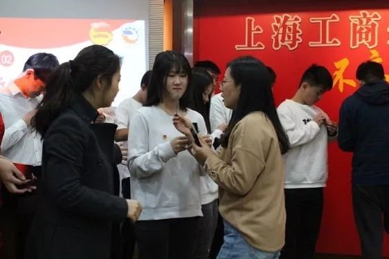 王丽老师为新团员佩戴团徽