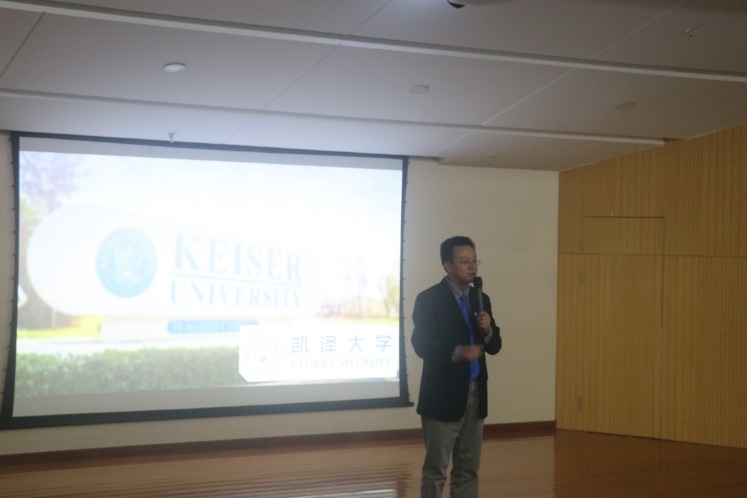 随后凯泽大学国际部校长李旬博士上台,Dr.Li首先代表美方大学校长向大家问好,并介绍了凯泽大学美国大学的排名以及综合实力,希望在座的同学们通过自己的努力顺利取得凯泽大学证书。