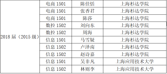 2018年,智能制造与信息工程学院共有10名学生成功考上本科院校。其中8人考取上海杉达学院,2人考取上海应用技术大学。
