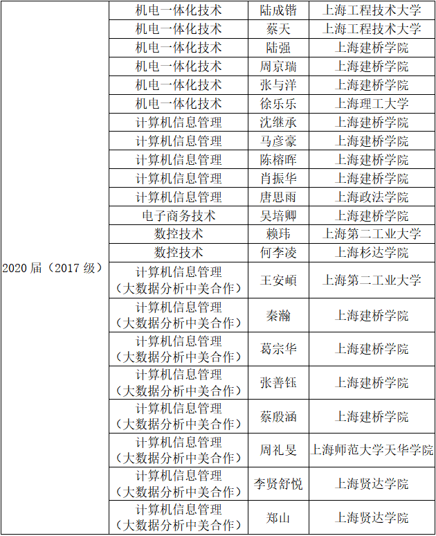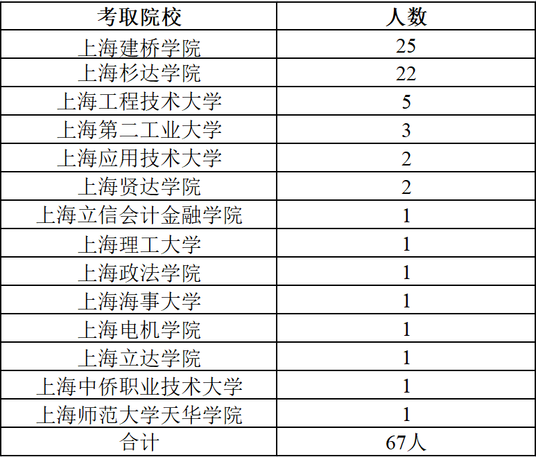 2020年,智能制造与信息工程学院共有22名学生成功考上本科院校。其中12人考取上海建桥学院,2人考取上海工程技术大学,2人考取上海第二工业大学,2人考取上海贤达学院,1人考取上海理工大学,1人考取上海政法学院,1人考取上海杉达学院,1人考取上海师范大学天华学院。