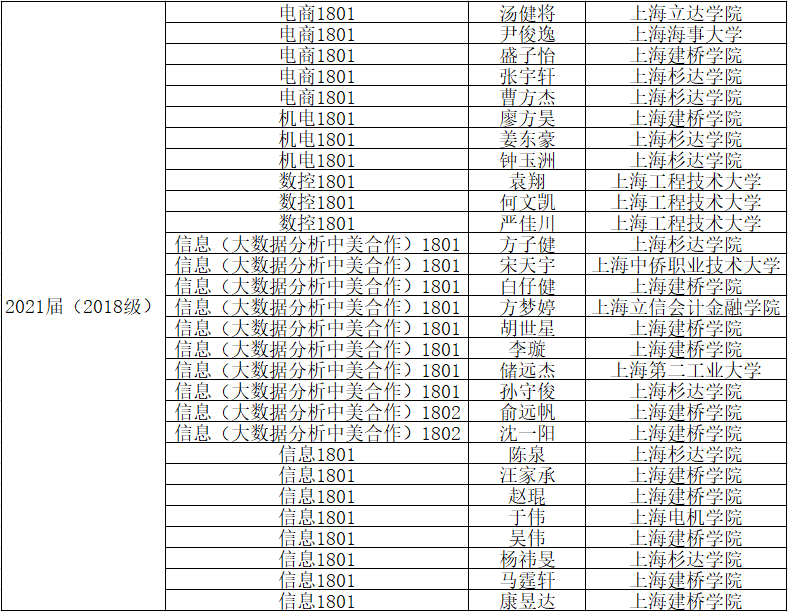 2021年,智能制造与信息工程学院共有29名学生成功考上本科院校。其中12人考取上海建桥学院,8人考取上海杉达学院,3人考取上海工程技术大学,1人考取上海海事大学,1人考取上海第二工业大学,1人考取上海立信会计金融学院,1人考取上海中侨职业技术大学,1人考取上海电机学院,1人考取上海立达学院。