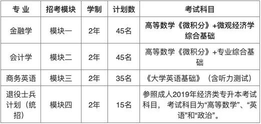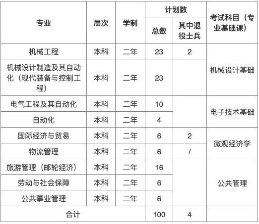 2020年“专升本”招生总计划为100人,其中含退役士兵计划4人。
