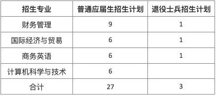 2020年“专升本”招生总计划为30人,其中含退役士兵计划3人。