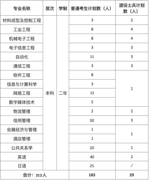 2020年“专升本”招生总计划为212人,其中含退役士兵计划29人。