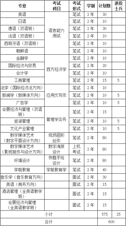 2020年“专升本”招生总计划为600人,其中含退役士兵计划25人。
