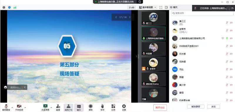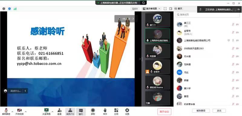 为加强学生对综合实习的认识和了解,推动我院20级毕业生就业工作顺利开展,智能学院邀请上海烟草包装印刷有限公司于10月19日下午14:00在腾讯会议举办了线上招聘会。智能制造与信息工程学院副院长唐三三及20级学生参加了此次会议,招聘会由20级辅导员金琴芳主持。