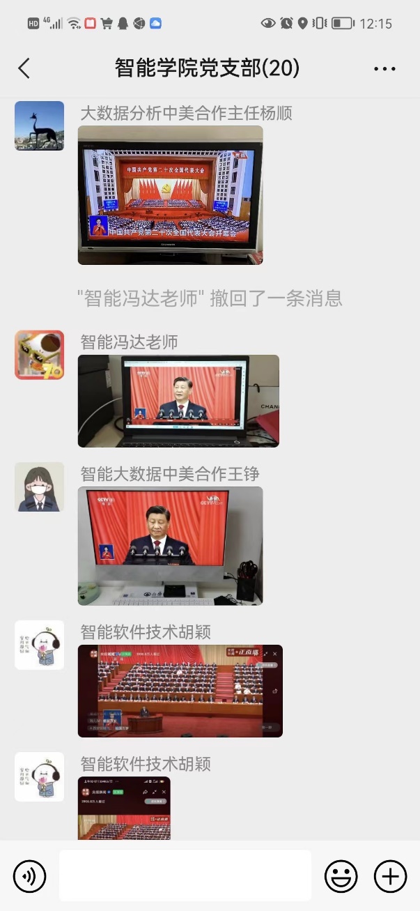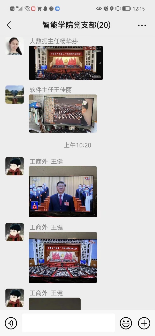 2022年10月16日,智能学院党支部组织党员学习中国共产党第二十次全国代表大会精神。根据当前疫情防控要求,在党支部书记唐三三老师的安排下,本支部同志自行进行直播学习,同志们的学习心得与体会如下:杨顺:党的二十大胜利召开,是我党新长征中的一个重要里程碑,听了总书记的报告,分享了十八大以来的丰硕成果,更使我们看清了新的目标和使命。我坚信大会以后,我们国家和民族将会在共产党的引领下完成民族伟大复兴的神圣使命。祝大会圆满成功!