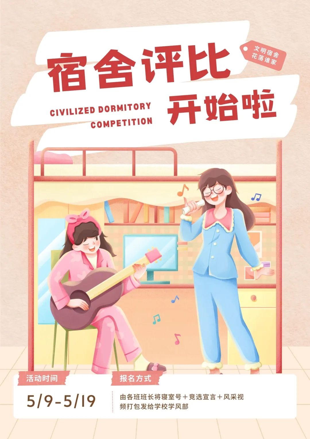 在满足安全卫生检查要求的前提下进行美化,具体美化不做硬性要求,尽可能展示出自己宿舍的特色风采