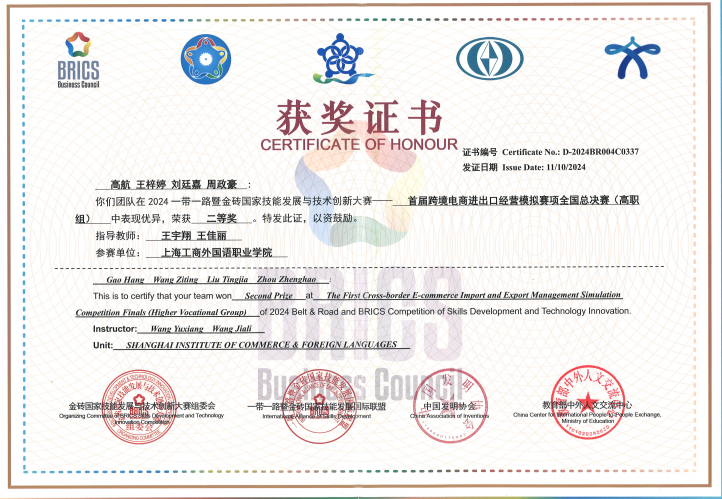 11月10日,为期三天的“2024一带一路暨金砖国家技能发展与技术创新大赛首届跨境电商进出口经营模拟赛项国内总决赛”,在漳州职业技术学院圆满落下帷幕。来自全国各省市的99支队伍,共594名学生和老师齐聚一堂,共同见证了这场技能与智慧的较量。我校参赛队伍在此次大赛中表现出色,脱颖而出,荣获高职组二等奖,为我校赢得了高度的认可和赞誉。