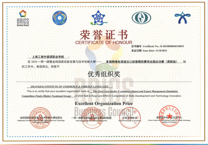 1110日,为期三天的“2024一带一路暨金砖国家技能发展与技术创新大赛首届跨境电商进出口经营模拟赛项国内总决赛”,在漳州职业技术学院圆满落下帷幕。来自全国各省市的99支队伍,共594名学生和老师齐聚一堂,共同见证了这场技能与智慧的较量。我校参赛队伍在此次大赛中表现出色,脱颖而出,荣获高职组二等奖,为我校赢得了高度的认可和赞誉。