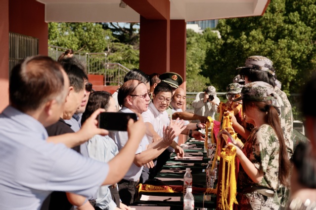 表彰环节中,陈锦楠排长宣读了军训优秀学员名单,各二级学院院长为优秀学员代表颁发荣誉证书;王顺利指导员宣读了优秀连队名单,校领导为优秀连队颁发锦旗。掌声不断,荣誉属于每一位拼搏的学子。
