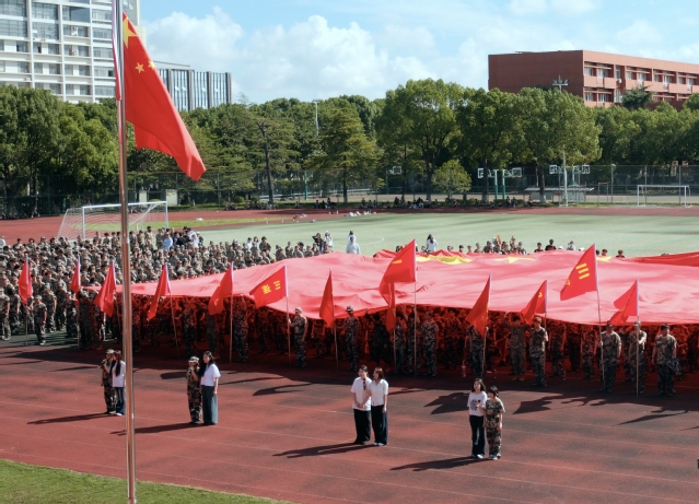 在军训成果展示环节,各连队方阵步伐整齐、口号嘹亮,展现了2025级新生经过军事训练后昂扬的精神风貌和严明的纪律意识。