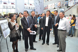 捐赠仪式后,学院陈伟南等老师为艺术设计系师生作品展剪彩。与会领导和师生们一起参观了布置在图书馆二楼大厅的艺术设计专业师生作品。(院办供稿)
