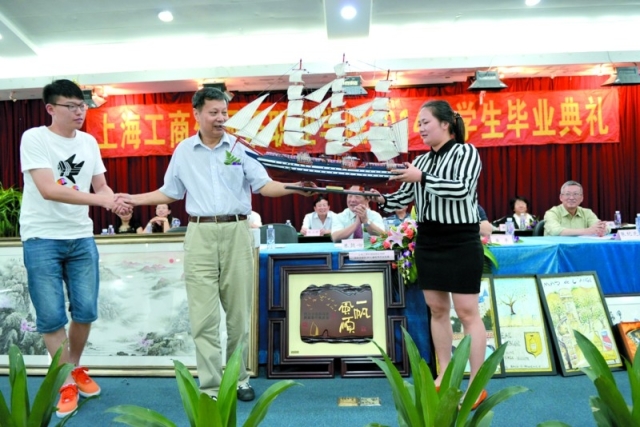 图为该院机电系毕业生向学院赠送一艘帆船模型