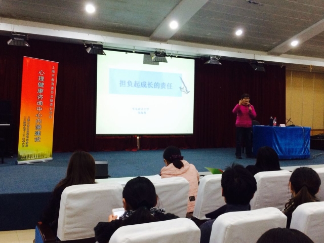 2015年4月14日晚,我院心理健康咨询中心在4号楼四楼举办了《担负起成长的责任》讲座。该讲座作为我院承担上海市教育委员会德育处心理健康教育与发展中心内涵建设项目的活动之一,邀请到了华东政法大学心理健康教育与发展中心主任张海燕教授担任主讲。会议由心理咨询老师陈江媛主持,学院党委副书记周春林、学生处处长沈李、学院专兼职辅导员、心理健康咨询中心教师以及广大学生参加了讲座学习。