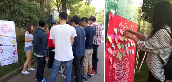 5月25日是全国大学生心理健康日,“5·25”谐音即为“我爱我”。为呼吁学生关爱自我,认识自我,悦纳自我,我院心理健康咨询中心在中区1号楼医务室门口开展“525”心理健康日宣传活动。活动通过参与者将“心语”贴到“心愿墙”上、发放中心宣传手册和卡贴等形式开展。