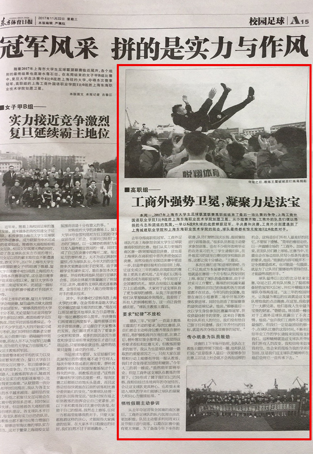 本周一,2017年上海市大学生足球联盟联赛高职组结束了最后一场比赛的争夺,上海工商外国语职业学院1比0战胜上海东海职业技术学院如愿卫冕。从小组赛开始,工商外的队员们便以昂扬的斗志和团结的氛围,一举以6战0失球的战绩蝉联冠军。半决赛和决赛,工商外分别遭遇到了上海城建职业学院和上海东海职业技术学院的阻击,球队最终都有惊无险地1比0战胜对手。