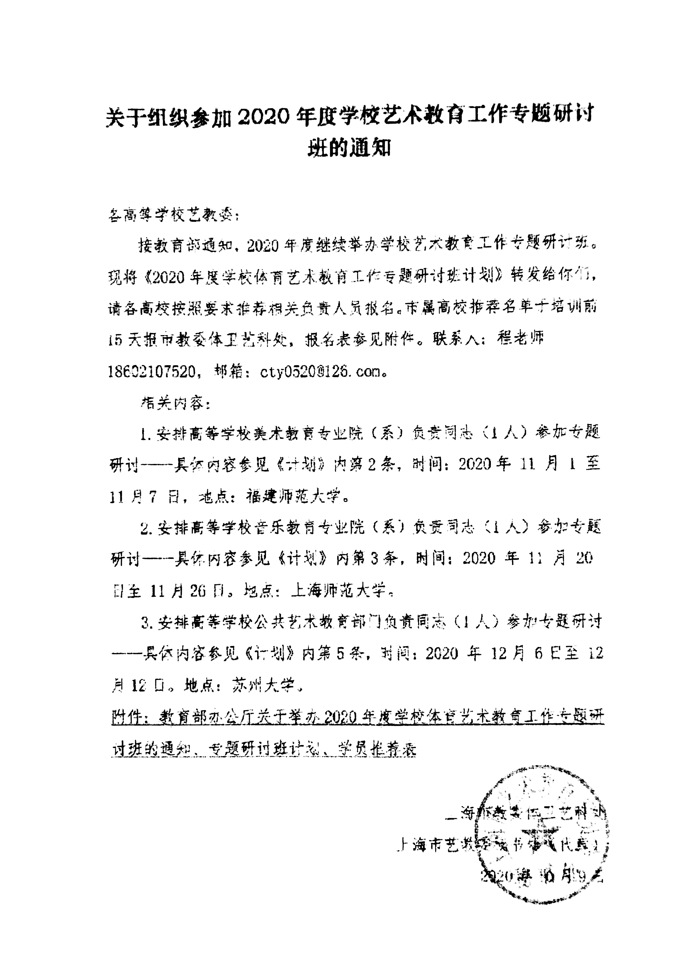 按照教育部通知,2020年度继续举办学校艺术教育工作专题研讨班,现转发《2020年度学校体育艺术教育工作专题研讨班计划》,请有需要的部门和教师于2020年11月2日前至人事处预报名。