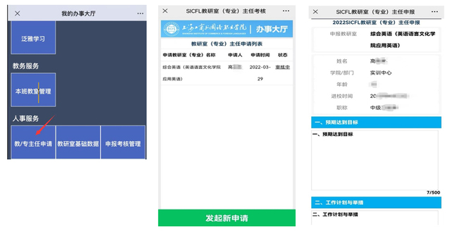 方式一:学校公众号-师生服务-我的应用-应用-人事服务-教/专主任申请