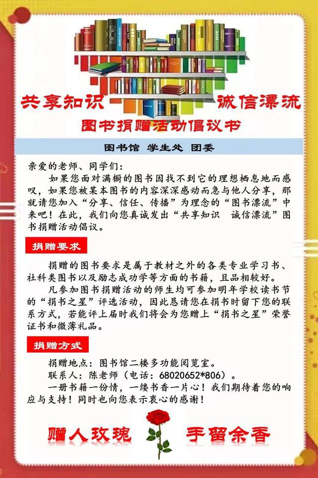 凡参加“知识共享 诚信漂流”图书捐赠活动的师生均可参加明年学校读书节的“捐书之星”评选活动,因此恳请您在捐书时留下您的联系方式,若能评上届时我们将会为您赠上“捐书之星”荣誉证书和微薄礼品。