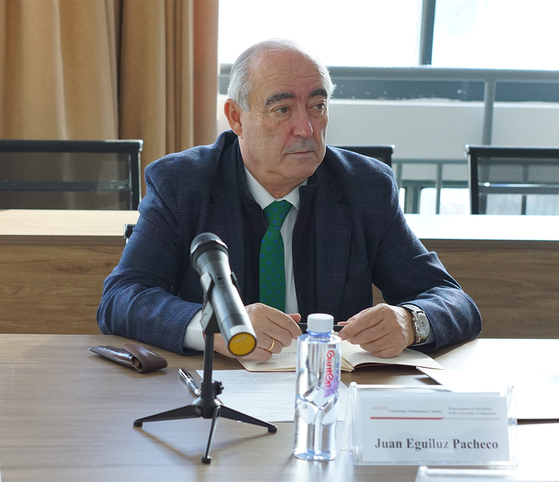 萨拉曼卡大学校长代表 Juan Eguiluz Pacheco 教授在发言中表达了他再次来华访问的兴奋之情。他对我校与萨拉曼卡大学间的合作关系给予极高的评价,并且表示萨拉曼卡大学十分期待我校师生能够前往西班牙进行学习与交流活动。此外,该校还可以为西班牙语专业教师提供包括语言技能提升及教学方法创新在内的培训,以进一步加深两校之间的合作。