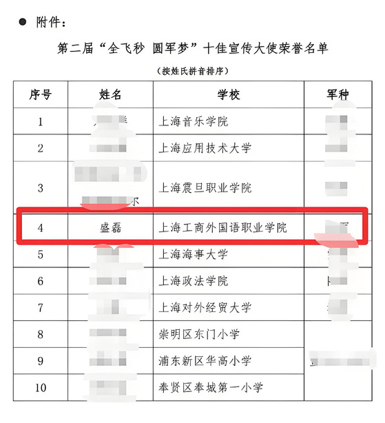2024年学校荣获浦东新区首批“戎爱学校”称号;武装部程光崧老师获评上海市学校国防教育先进个人;军旅社宋盛获2024年上海市第四届退役大学生士兵风采展示“风采之星提名奖”;盛磊获评上海市第二届“全飞秒 园军梦”十佳宣传大使;张耀文、余嘉、蔡沅圜、徐潇俊、吴诺伊获第六届中华经典诵写讲大赛“诵读中国”经典诵读大赛上海赛区一等奖;热普开提·艾合买提获第三届“谁的青春不奋斗”上海高校学生故事讲演大赛优胜奖。