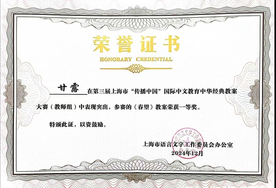 甘露老师的获奖,不仅彰显了我校教师在语言文化教育方面的专业水平与创新能力,也为职业教育领域参与国际中文教育提供了宝贵经验和示范案例。未来,我校将继续鼓励教师积极参与各类高水平竞赛,深化课程建设与教学改革,为中华文化的传播与国际中文教育贡献力量。