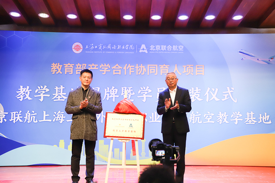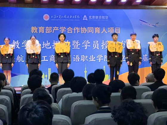 12月6日,上海工商外国语职业学院与北京民用联合航空公司(简称“北京联航”)合作建设的教育部产学合作、协同育人项目——工商外教学基地首届“授装暨揭牌仪式”在学校四号楼报告厅举行。