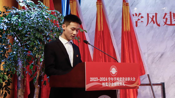 国家奖学金获得者、艺术设计与传媒学院王溯舜同学代表发言。他回顾了自己的大学生活,表达了对老师们无私关爱和耐心指导的感激之情。同时,他也向学弟学妹们发出了诚挚倡议,希望他们能够珍惜大学时光,努力奋斗,为国家和社会的繁荣富强贡献自己的力量。