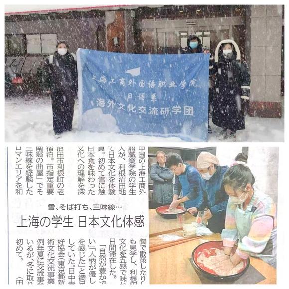 我校研学团首站抵达日本著名的雪国地带——群马县利根沼田地区,同学们深入体验当地的传统艺术与饮食文化,尝试演奏日本传统乐器三味线,亲手体验手打荞麦面的制作。在文化探访环节,大家聆听了沼田市利根町的长者讲述当地历史与民俗艺术,对日本古老建筑的保护技艺、传统庆典的由来以及雪国生活方式有了更深的理解。当地官方报纸对我校学生的交流活动予以专门报道。