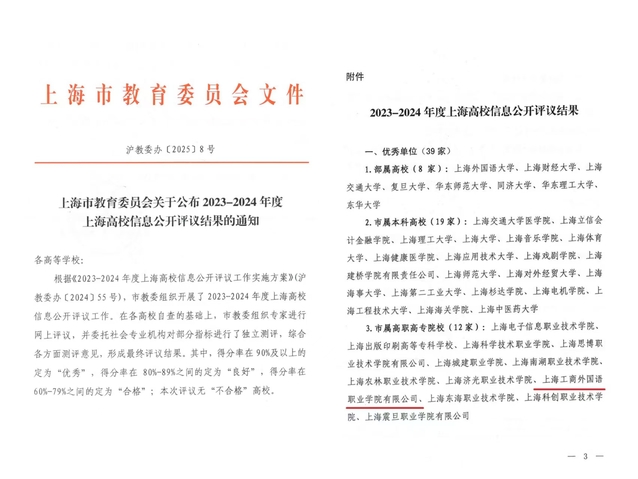 近日,上海市教育委员会发布《上海市教育委员会关于公布2023-2024年度上海高校信息公开评议结果的通知》(沪教委办〔2025〕8号),我校获评“优秀单位”。