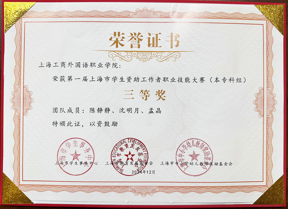 近日,由上海市教育委员会指导,上海市学生事务中心、上海市教育发展基金会和上海市中小学幼儿教师奖励基金会共同主办,同济大学承办的第一届上海市学生资助工作者职业技能大赛公布获奖名单。我校学生资助工作队伍在大赛中荣获三等奖。