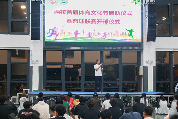 校领导黄正为启动仪式发表致辞,他指出,在健康中国战略深入推进的时代背景下,以体育为纽带搭建起两校交流的桥梁意义深远。希望借助体育文化节这一平台,鼓励更多师生走出教室、奔赴运动场,在竞技拼搏中锤炼团队精神,在互动交流中推动两校深度融合。他向全体师生发出积极号召,鼓励大家踊跃投身体育锻炼,热情参与体育文化节的各项赛事。同时,他希望能将本次体育文化节精心打造成为一场气氛热烈、组织有序、师生携手共赴的体育盛会,并预祝体育文化节和篮球比赛圆满成功。