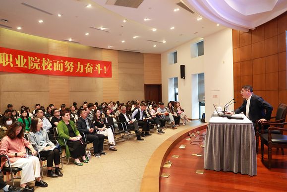 当日下午,张靖主任应邀为两校师生代表作题为《教育强国,国际教育赋能职业教育》专题报告。报告从职业教育发展现状出发,深入剖析教育强国战略带来的机遇,明确提出提升职业学校关键能力建设任务,详细阐述国际教育赋能职业教育的实践路径与策略。报告内容详实、案例丰富,报告厅座无虚席。精彩的报告让师生受益匪浅,为师生探索职业教育国际化发展提供了新思路。