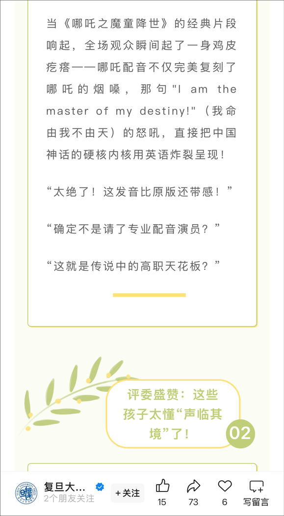 据悉,该团队此前代表我校参加上海赛区决赛时,正是凭借《哪吒之魔童降世》中“我命由我不由天”的同一高燃片段,以绝佳的配音演绎摘得上海赛区特等奖。从黄浦江畔到鹭岛之滨,他们用英语重塑中国神话的魂魄,让哪吒的呐喊响彻南北。