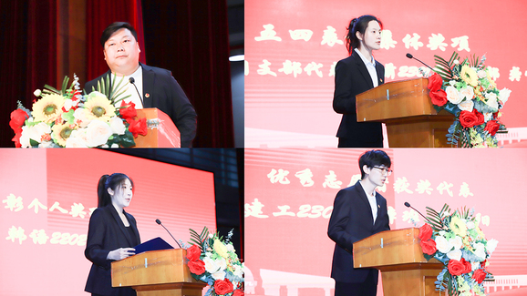 艺术设计与传媒学院分团委书记黄二涛作为五四红旗分团委获奖代表,学前2301高本支部龚雪凤同学作为五四红旗团支部获奖代表,韩语2202班王恬恬同学作为三好学生获奖代表,建工2301-高本班张皓阳同学作为优秀志愿者获奖代表,依次上台进行交流发言。
