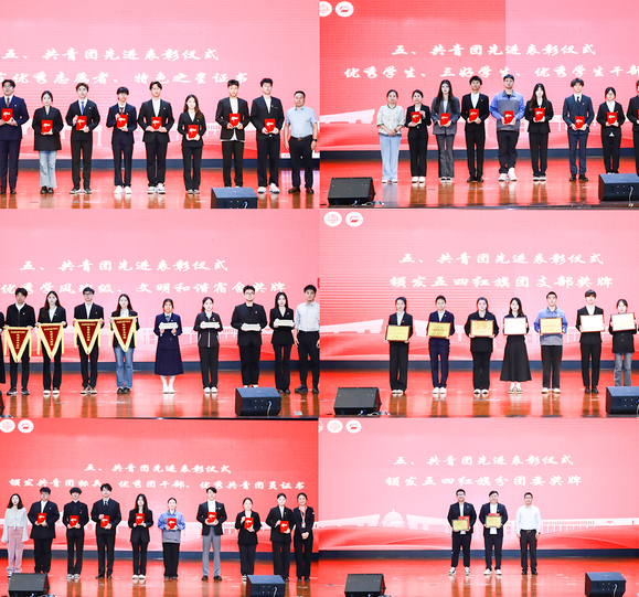 校领导、各学院学工副院长、院长助理为荣获“五四红旗分团委”“五四红旗团支部”“共青团标兵”等12类奖项的先进集体与个人颁发荣誉证书。