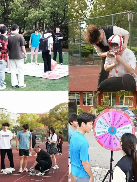 在学校后勤保卫处的指导下,大学生平安志愿者校园品牌项目《消防安全会》通过一系列寓教于乐的活动形式,普及预防火灾、应对火灾等消防安全知识,共同守护校园安全。本次活动采用“闯关式学习”的模式,在操场、教学楼、大草坪等多个场地展开,并设有“消防套圈”“消防飞行棋”“消防器材实操”等多个环节,增强了参与感与互动性。在操场现场,专业人员手把手指导参赛选手,详细讲解如何正确使用消防水带、防毒面具等常见消防设备,帮助同学们掌握实用技能,提高应对突发情况的能力。