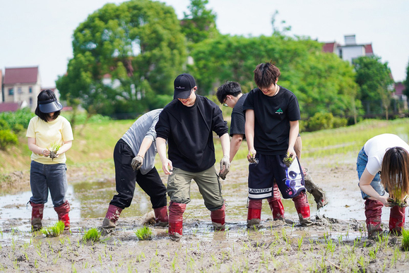 到达海沈村后,同学们迅速分成11个小组。各小组纷纷积极设计组名与口号。各小组充满创意的名称伴着充满青春活力的呐喊声回荡在田间,展现出学子们的青春朝气与昂扬向上的精神风貌。为确保实践效果,每个小组均配备一位经验丰富的当地农耕能手作为指导,通过生动讲解和现场示范,向同学们传授插秧方法和技巧,让同学们对插秧要领有了更直观的认识。