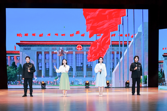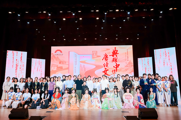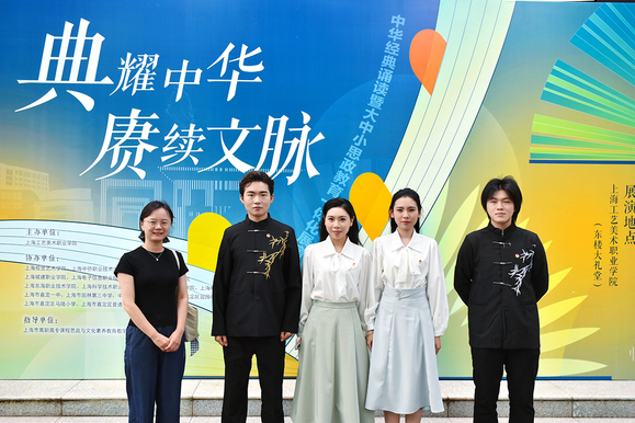 6月5日,由上海市高职高专课程思政与文化素养教育教学指导委员会指导、上海工艺美术职业学院主办的“典耀中华 赓续文脉”中华经典诵读暨大中小学思政教育一体化展演活动如期举行。来自全市17所大中小学的优秀师生代表齐聚一堂,以经典为媒、以诵读为桥,共同呈现了一堂跨越学段的“行走的思政课”。我校语言文字工作委员会甘露老师带领艺术设计与传媒学院、人文与教育学院的四名优秀学子张耀文、余嘉、蔡沅圜、徐潇俊,现场演绎获奖作品《诗颂风华》,用青春之声向经典致敬,展现了深厚的文化素养和昂扬的精神风貌。