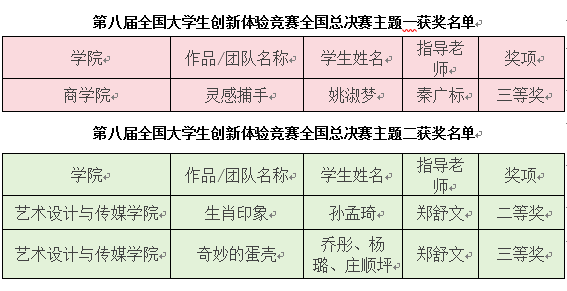 第八届全国大学生创新体验竞赛全国总决赛于6月4日公布获奖名单。本次竞赛由中国创造学会主办,东南大学承办,旨在激发大学生创意灵感,培养创新思维,提高创新实践能力,孕育创新成果雏形。全国共有403所高校,4659组团队,1万余名参赛选手同台竞技。其中汇聚985高校22所,211高校39所,双一流高校48所,3所海外高校。面对强敌,我校高度重视,在创新创业学院精心组织和各二级学院紧密配合下,共获得二等奖1项,三等奖2项的佳绩!