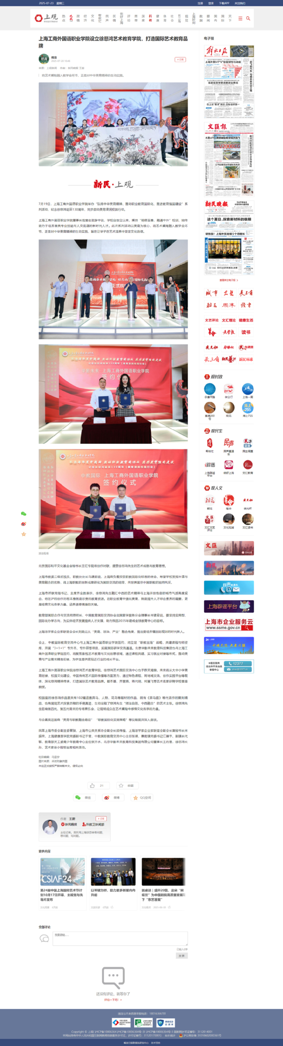 7月19日,上海工商外国语职业学院举办“弘扬中华美育精神、推动职业教育国际化、推进教育强国建设”系列活动,纪念徐悲鸿诞辰130周年,同步启动美育浸润校园行动。
