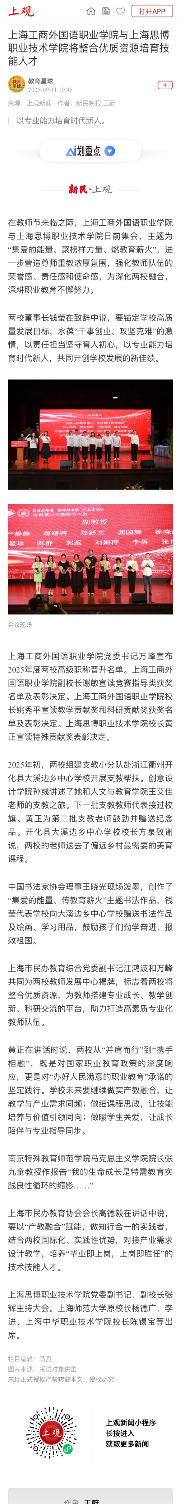 在教师节来临之际,上海工商外国语职业学院与上海思博职业技术学院日前集会,主题为“集爱的能量、聚榜样力量、燃教育薪火”,进一步营造尊师重教浓厚氛围,强化教师队伍的荣誉感、责任感和使命感,为深化两校融合,深耕职业教育不懈努力。