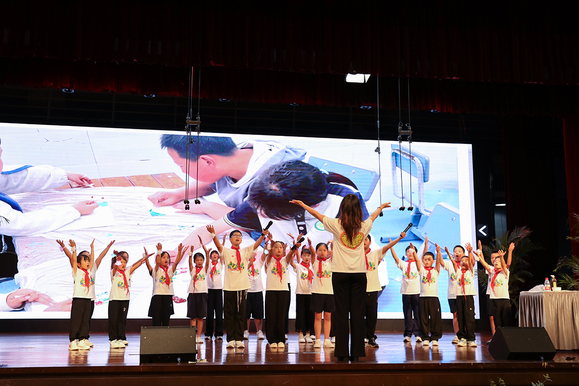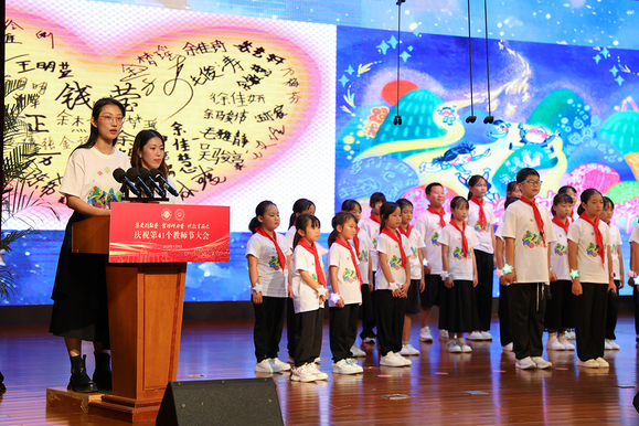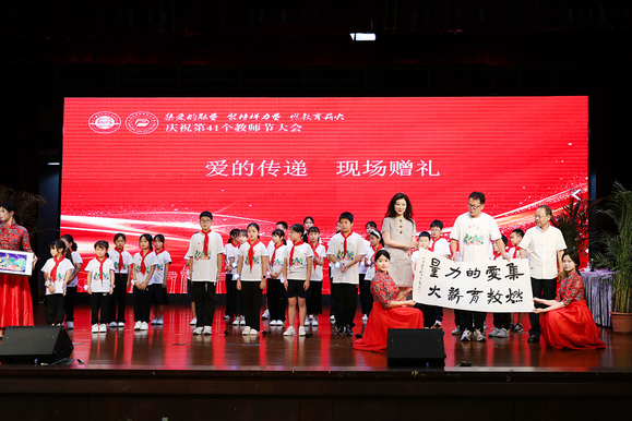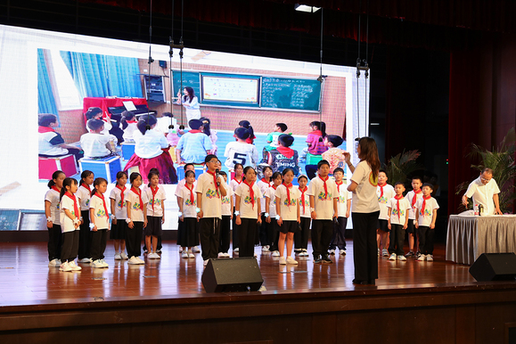 表彰环节后,大会迎来温馨环节。2025年初,两校组建支教小分队赴浙江衢州开化县大溪边乡中心学校开展支教帮扶。“对于大山里的孩子们来说,音乐不仅是do-re-mi,更是他们对外面世界最真挚的想象。”艺术设计与传媒学院孙彧讲述了她和人文与教育学院王艾佳老师的支教之旅,她们用旋律点亮孩子们的眼眸,用色彩勾勒他们心中的远方,让偏远山村的孩子借由艺术触摸更广阔的天地。现场,孩子们演唱《祖国有我》,稚嫩歌声满含感恩,演唱结束后齐声送上“教师节快乐”的祝福,这份纯粹的心意成为当天最温暖的节日礼物。随后举行支教校旗交接仪式,下一批支教教师代表接过校旗,正式接过“跨越山海传递教育爱心”的使命。黄正校长代表学校董事会为第二批支教老师加油并赠送纪念品。