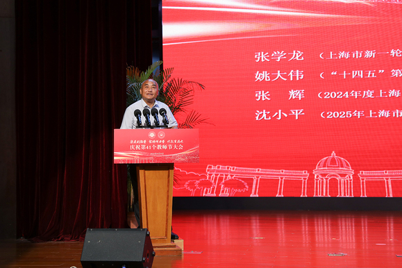 金秋九月颂师恩,同心筑梦启新程。9月9日下午,上海工商外国语职业学院与上海思博职业技术学院在学校大礼堂举行庆祝第41个教师节大会。大会以“集爱的能量、聚榜样力量、燃教育薪火”为主题,通过表彰先进、分享初心、传递使命,进一步营造尊师重教浓厚氛围,强化教师队伍的荣誉感、责任感和使命感,为深化两校融合,深耕职业教育不懈努力。