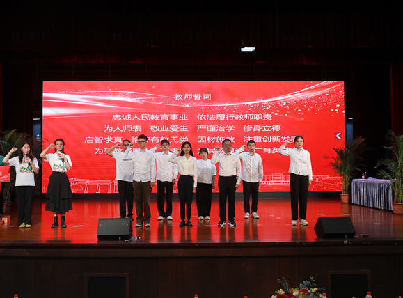 新入职教师代表在孙彧、王艾佳两位教师的带领下,高举右拳、庄严宣誓,铿锵有力的誓词回荡全场,不仅让新入职教师坚定了教育初心,更让在场每一位教育工作者重温了“为党育人、为国育才”的使命担当。