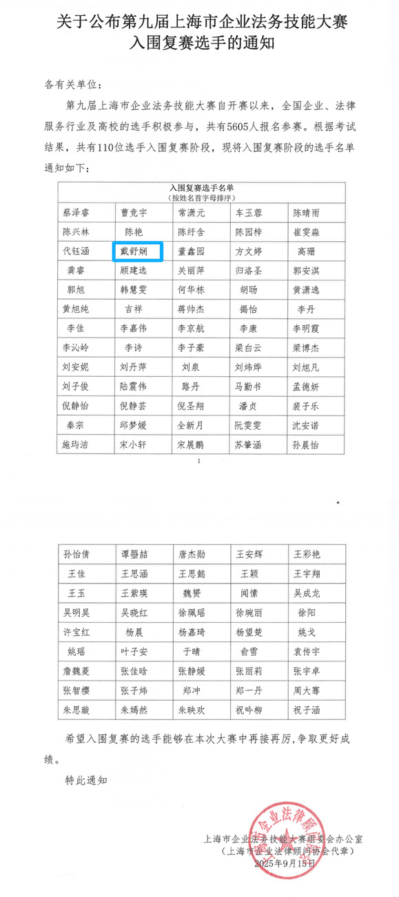 为鼓励参赛者,大赛为获奖选手提供了宝贵的职业发展机会。入围百强赛的选手可获得“第九届上海市法务技能大赛百强”电子荣誉证书;而像戴舒娴同学这样成功晋级复赛的学生还有机会参与上海市司法局“揽百计划”实习实训;获奖法律服务工作者将纳入上海市司法局基础人才库,优先推荐参评各类人才项目,表现突出的个人还可优先申报“上海市五一劳动奖章”。