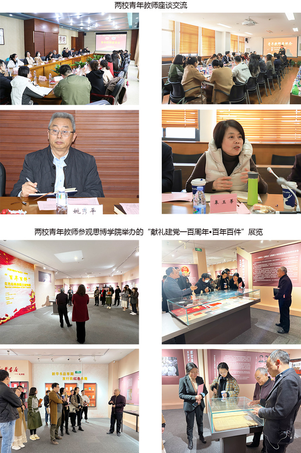 会后,两校青年教师参观了我校红色经典珍藏文献特展,人文教育学院执行院长刘毅讲解了党史教育对“思政课程和课程思政”的影响和作用。