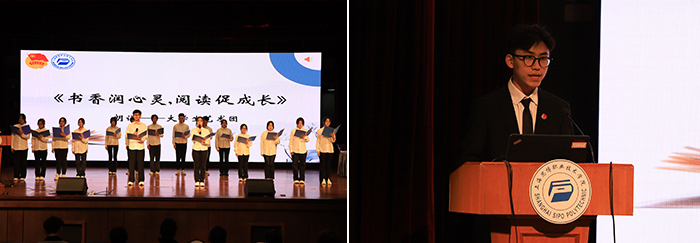 在美妙的音乐声中,学生艺术团朗诵《书香润心灵,阅读促成长》,学生代表葛佳麒向全校师生发起阅读倡议。