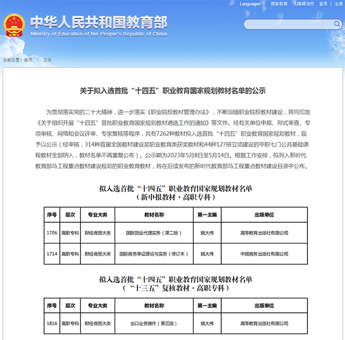 近日,教育部公布了入选首批“十四五”职业教育国家规划教材名单,我校副校长姚大伟教授主编的《国际商务单证理论与实务》、《出口业务操作》、《国际货运代理实务》3本教材入选。